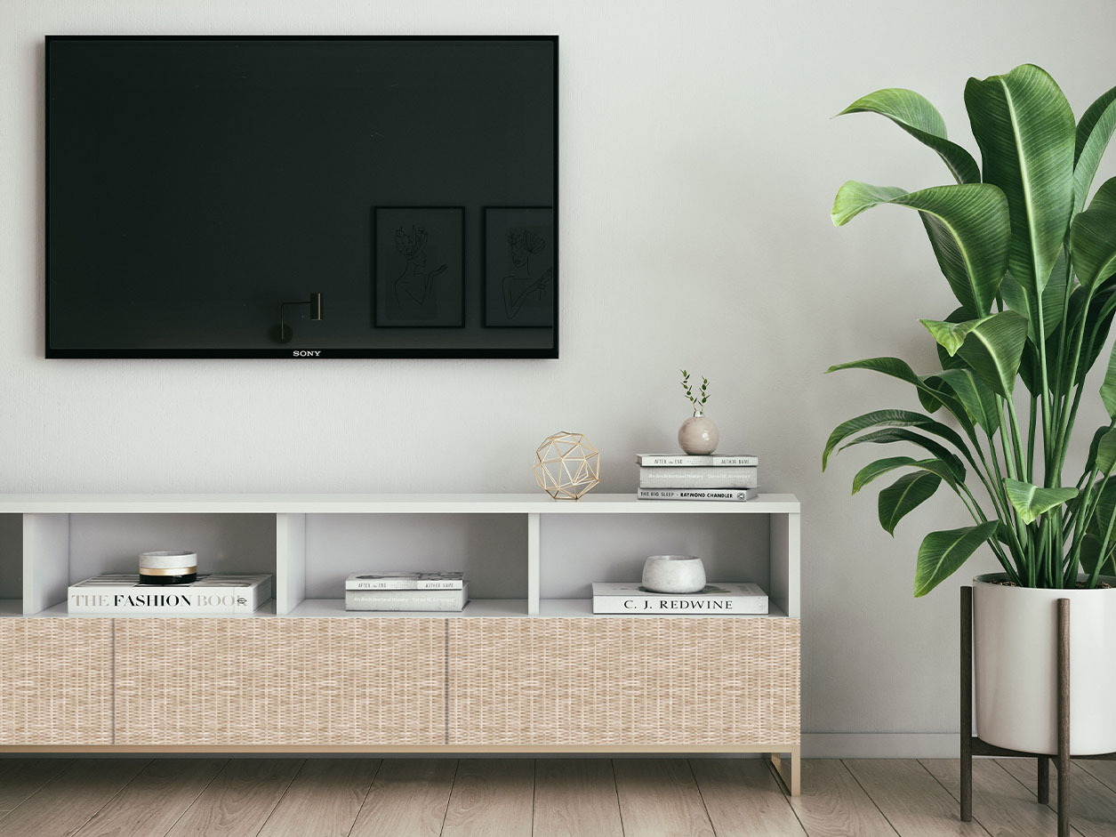 Le mot d'Eléonore : Ce motif trompe-l'œil de rotin vous permet d'intégrer cette matière facilement en rénovation de façades de meubles, tête de lit ou portes de placard. Nous avons opté pour une teinte très naturelle, avec ses nuances de beige, qui pourra par exemple être combiné a du bois pour un effet d'autant plus naturel.